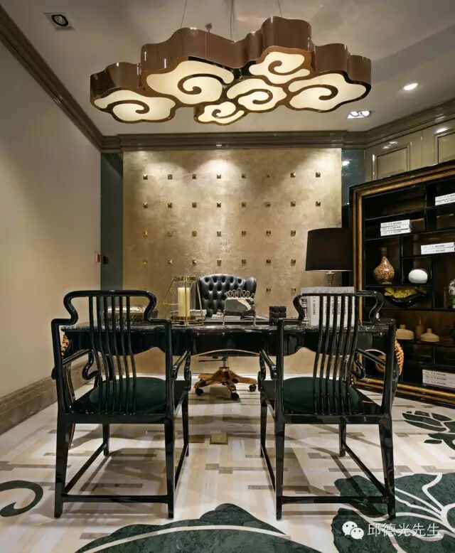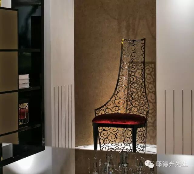 云椅是邱德光最知名的原创家具之一,以时尚思维借助科技赋予中国传统现代的意象外型,与墙面陈列的龙袍挂画同处一室,让旧中国有了耳目一新的味道。
