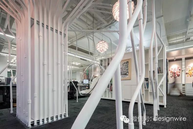 创意十足的Central Island,Island的前半部分是一个配备了多媒体设备的吧台区域,方便设计师们开展短暂的会议以及进行设计交流,Island的后半部分是一个由“竹林”环抱的休息区,将工作与生活有机地结合起来。蛋椅、松果灯、书籍等让设计师们在工作之余得到充分的放松,激发无限的创作灵感。