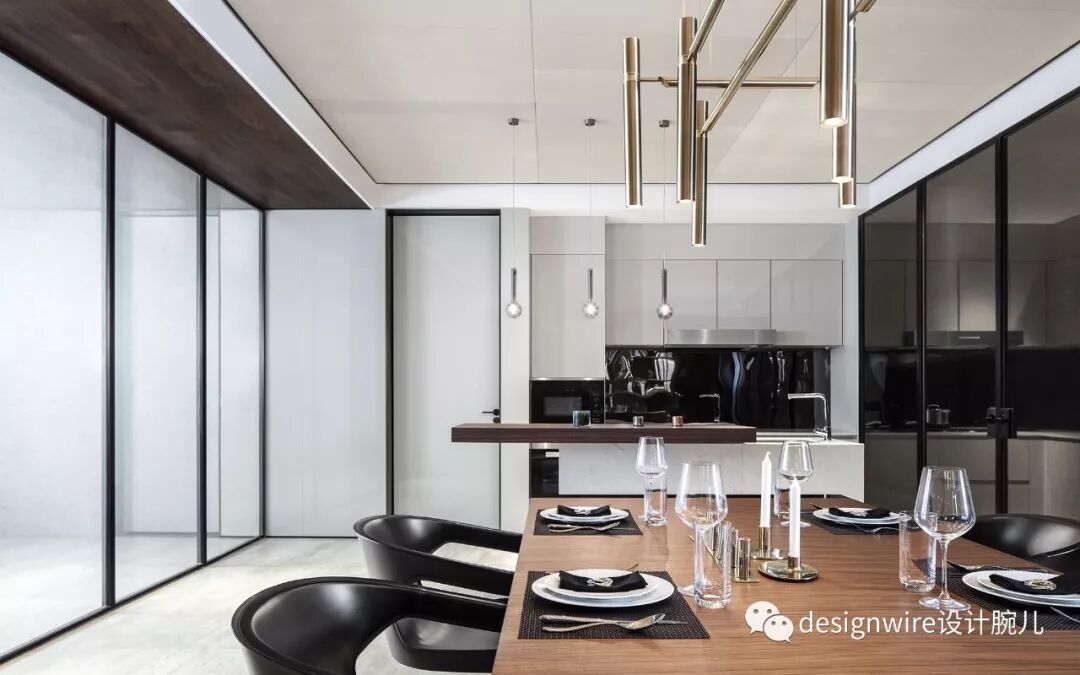 厨房到餐厅的区域,特意设计为会客吧台区,休闲区,品酒区和影音区,让其具有足够的开放性,即能满足多种会客功能,又赋予空间戏剧性的变化。