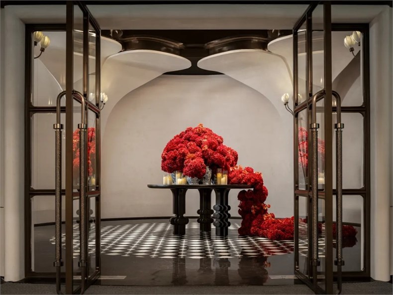 电梯轿厢以“精奢浮光”为题,金属编织壁面在灯光下流转柔和光泽,黑金地面沉稳而高级,每一处细节都在诉说对美的极致追求。艺术前厅“绽放的迎候”更如一场视觉盛宴——穹顶如花盛开,天光洒落,红色花艺蜿蜒生长,金属灯枝轻倚墙面,仿佛自然与艺术在此悄然相拥。