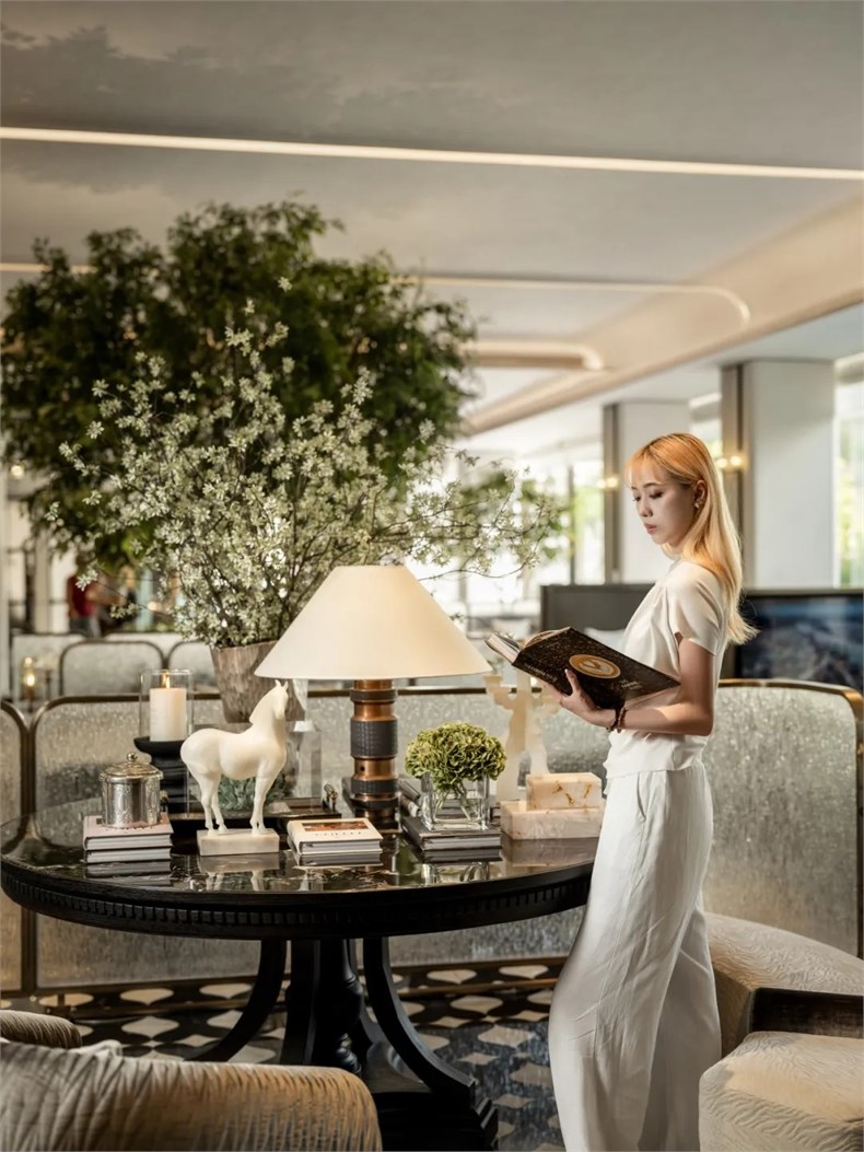 延续低饱和色调,自然光从侧面巧妙引入,与深浅有致的材质形成对比,柱体与墙面摒弃繁复,仅以金属细线勾勒轮廓,在黑白地面的铺陈下,整个场域传递出“雅而不奢,静而不寂”的东方精神底色。