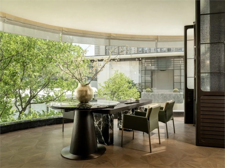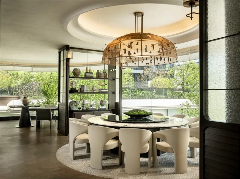 私宴区域的设计非常具有开放性,落地窗的景模糊了室内外的界限。餐厅设计延伸了多维想象及艺术审美的无限可能,搭配精致的器皿,造就了简约雅致的气质。
