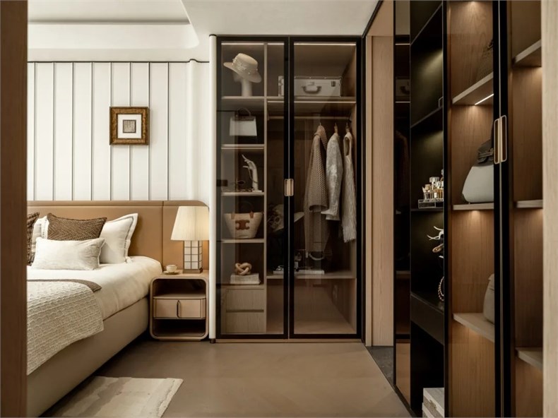 主卧室延续整体空间的海派设计语言,在理性秩序中融入柔和线条与细腻材质,营造出雅致、舒适且富有东方韵味的私密休憩空间。温润柔和的中性色调为主,结合米白、原木与金属等元素,呈现“刚柔并济”的美学平衡。大面积弧形落地玻璃窗引入充足自然光,令空间通透明亮,并与室外景观无缝衔接,增强居住者的感官体验。