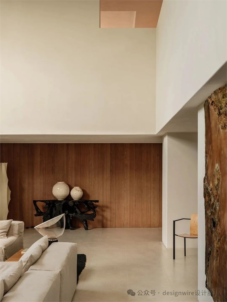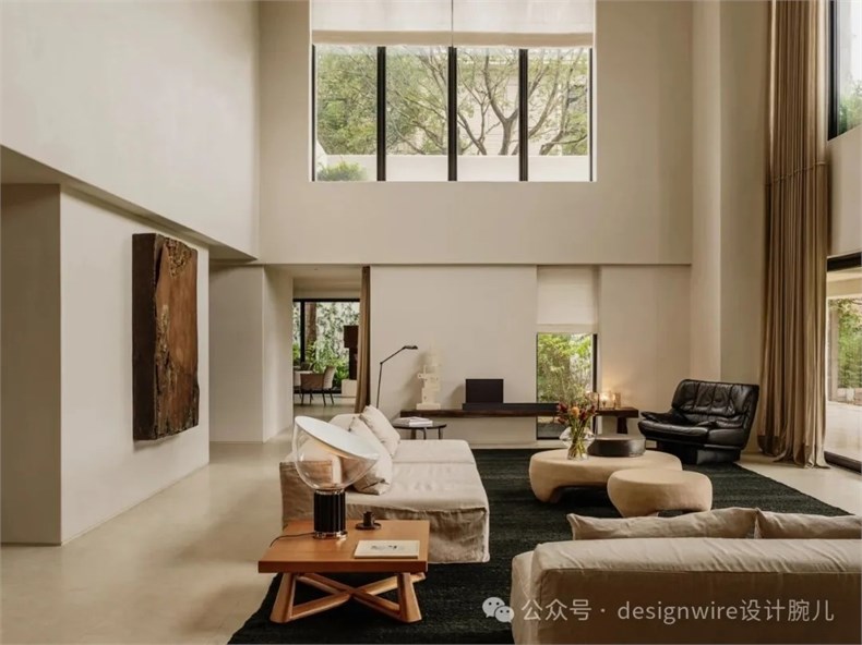 会客厅挑空设计强化通透感,浅色瓷砖、实木家具与亚麻窗帘营造舒展氛围。大面积落地窗引入光影与景观,让室内外景致自然流动。光线、色彩、材质与家具的搭配,让居住者在室内也能感受到自然的温度与宁静。