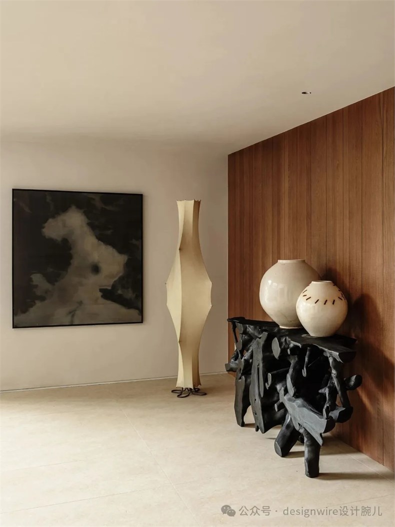 谢柯的设计中,自然之感是核心命题。地面以浅色仿石材瓷砖和原木地板为底,墙面米色纹理涂料搭配局部石材装饰,软装以亚麻、棉麻为主,点缀典雅的艺术品,回归朴素舒适又充满艺术感的美学。