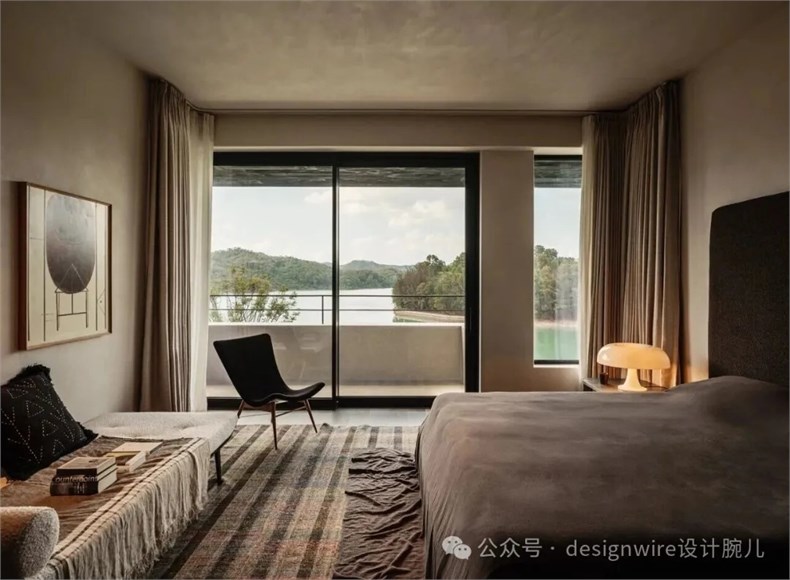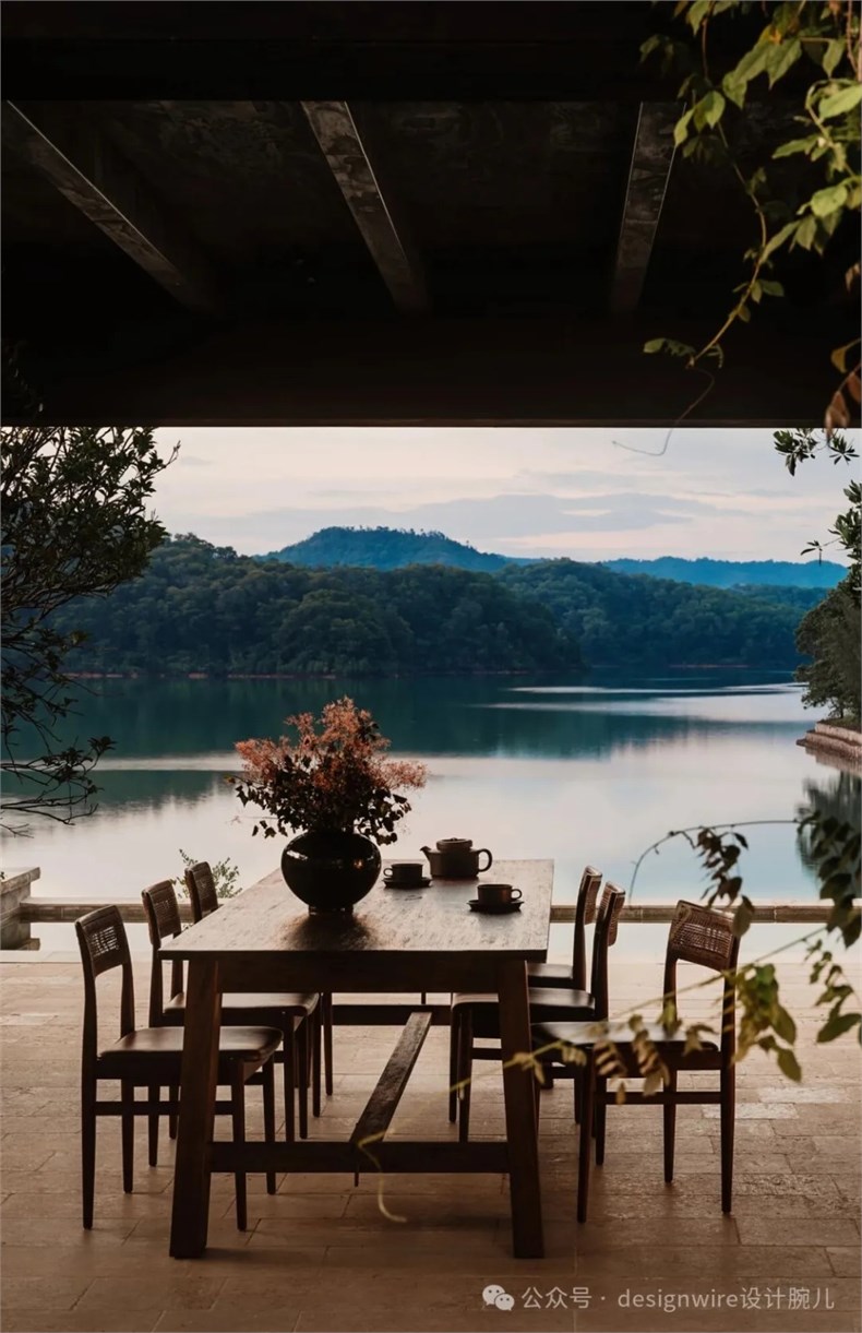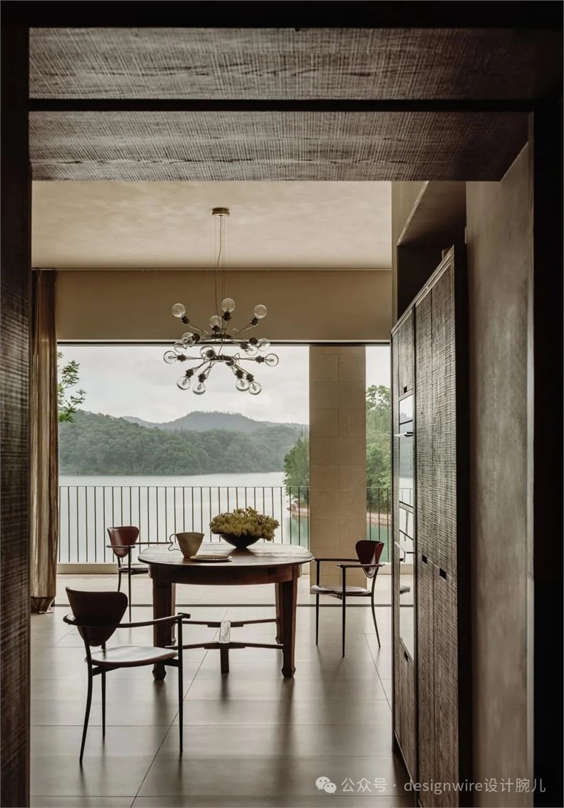 空间借景湖光山色,通过大面积落地窗、下沉庭院和绿植渗透,模糊室内外界限。阳光、绿意与山色随视线流动,环绕的湖山、温润如春的绿意。