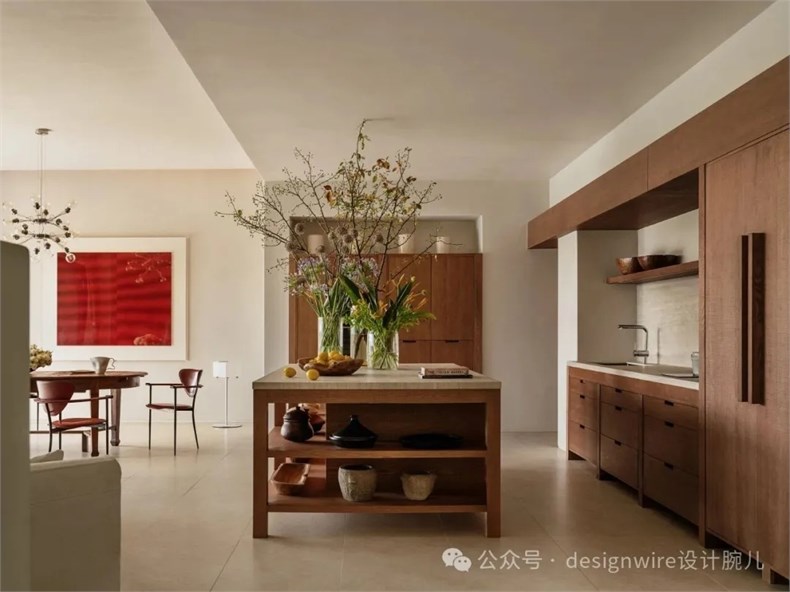 厨房与餐厅形成了无界空间,家人围绕餐桌操作与互动,亲情聚合,生活的烟火气溢满整个家屋。