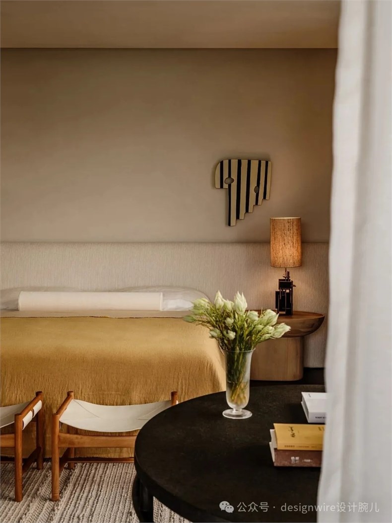 四间次卧满足着多代同住需求,柔和的米色系墙面与进口家具,构筑出空间的宁静氛围。延续马寅自阿那亚创始时的夙愿,这处室内空间也允许每个家庭成员相互看见、彼此关照。