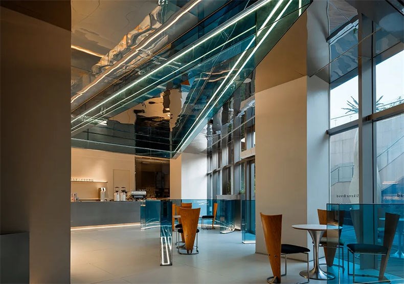 将镜面材质插入公区顶面,向上无限延伸几何形态与环境细节,瞬间放大了空间的纵深感。