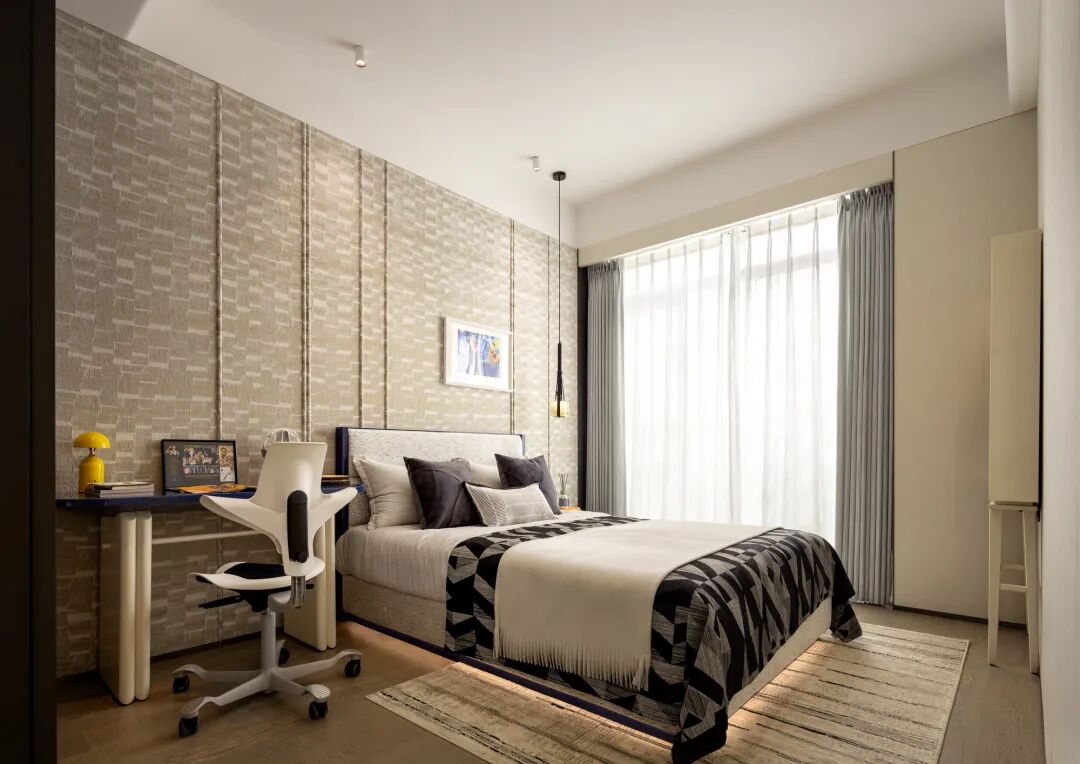 主卧以从容气度铺叙空间格局,床头墙面以简约的纵向凹槽勾勒出光影的轨迹,如同隐现的秩序诗行。
