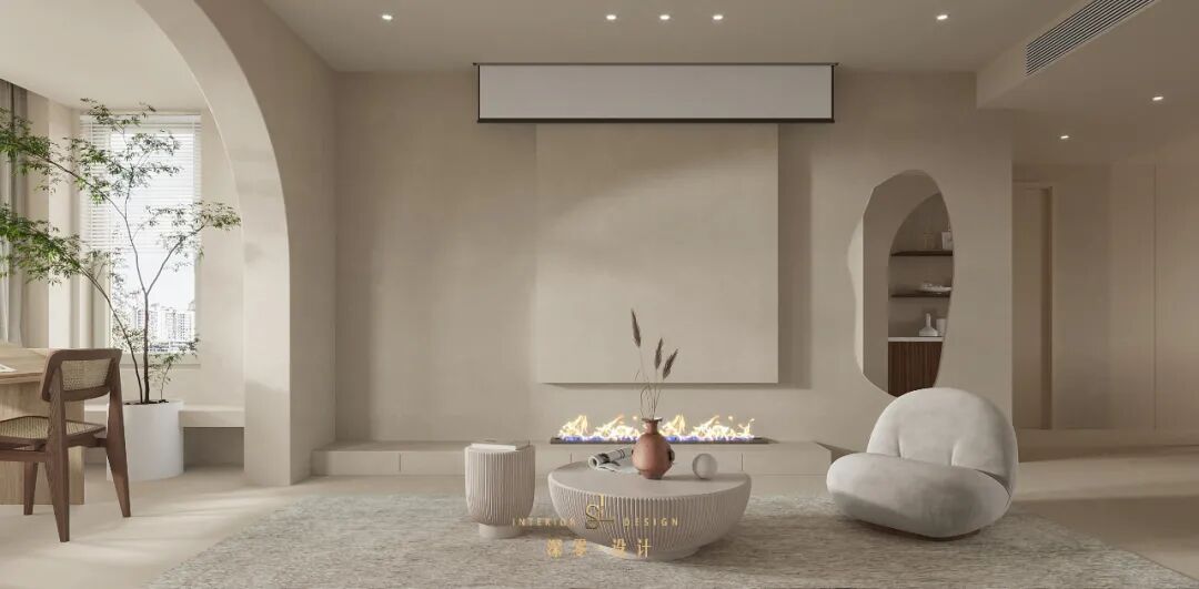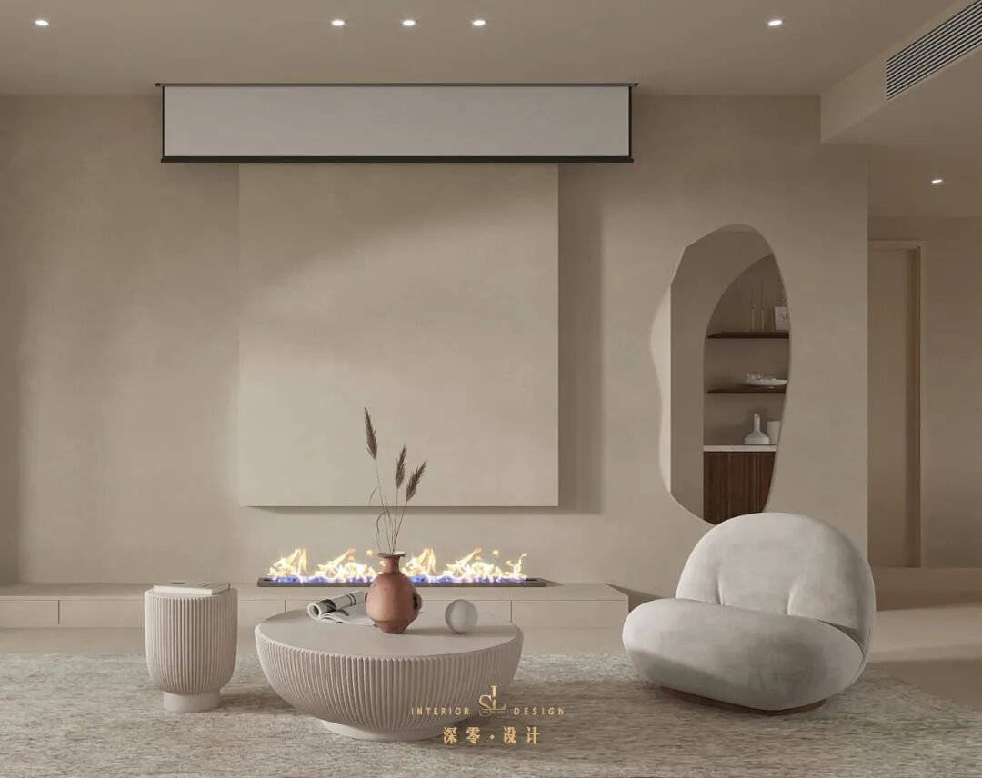 舍弃电视和传统照明方式,由投影与无主灯设计代替,幕布下方设壁炉和地台式收纳柜。