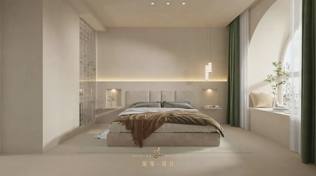 The bay window of the master bedroom breaks the common square posture. It is presented in an arc shape with a plain white gauze and green curtain. There is only a green plant beside the window, but it is also similar. There are mountains, waters and terraces.