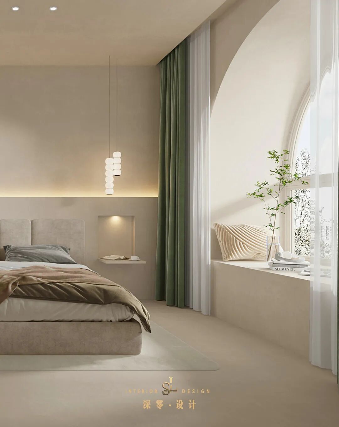 主卧飘窗更是打破常见的四方姿态,以弧形呈现,搭配素雅的白纱绿帘,仅一株绿植至于窗边,却也似,有山有水有楼台。