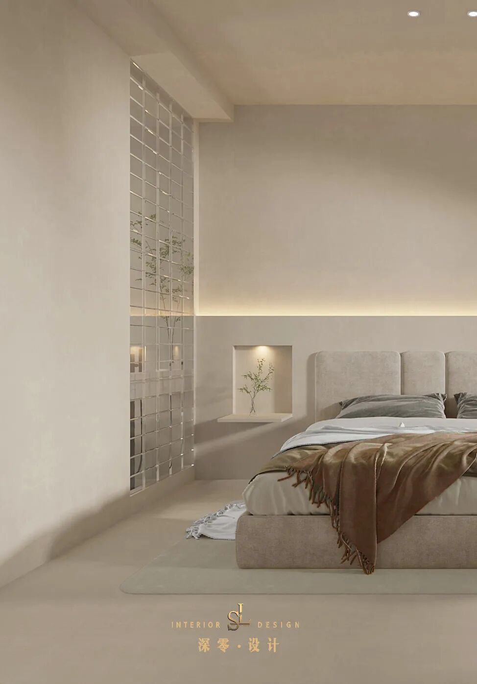 主卧取消厚重床头柜,由壁龛搁板代替,内嵌壁灯,上嵌灯带,轻盈、质朴,微小的细节也散发着迷人的魅力。