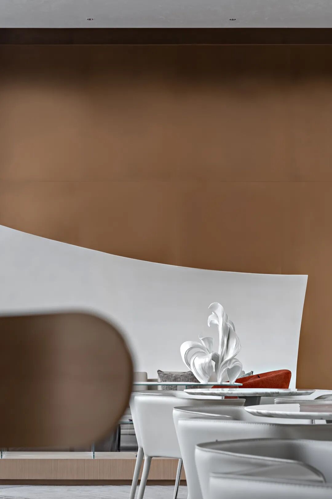 软装呼应空间艺术调性弱化整体色彩,在灰与白的静谧色彩中,增添自然温暖的枫叶色,呈现沙漠上日出日落晕染大地的景象,跳跃的色彩呼应黄沙高土粗犷与生命力,散落各处,拂去生活中的繁琐,给人带来希望和期望。