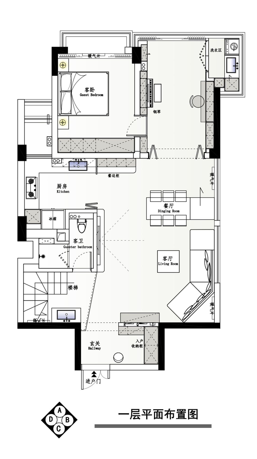 ①一层主要为动区生活空间,优化客餐厨布局及动线,增设多功能琴房,给予居者更舒适全面的生活体验。
