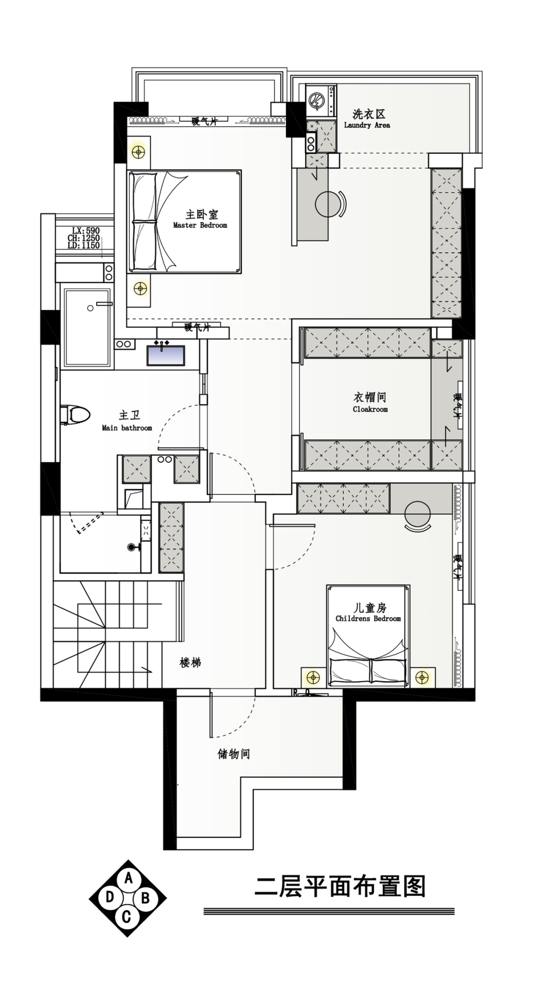 ②二层为主卧套间,调整空间配比,增设衣帽间及办公区,放大生活细节。