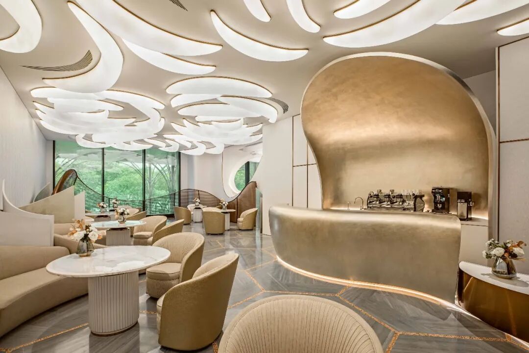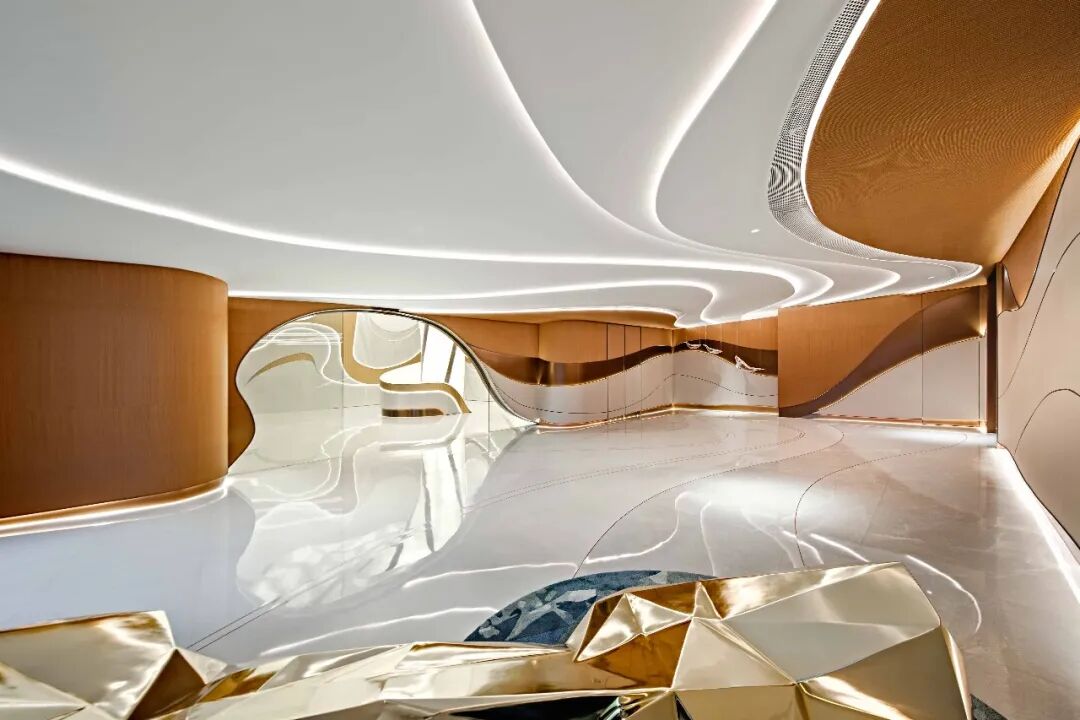 在设计空间时,从自然界万物提取不同的灵感主题,如一层大堂以巨型吊灯来表现“花瓣”盛开的主题,墙面用编织金属和树脂板交替曲线围绕出有富有层次感的律动效果。墙壁的曲线像自然界河流的走向,像敦煌壁画人物的衣袂飘带,也像画笔描边勾勒出云雾缭绕的仙境轮廓。