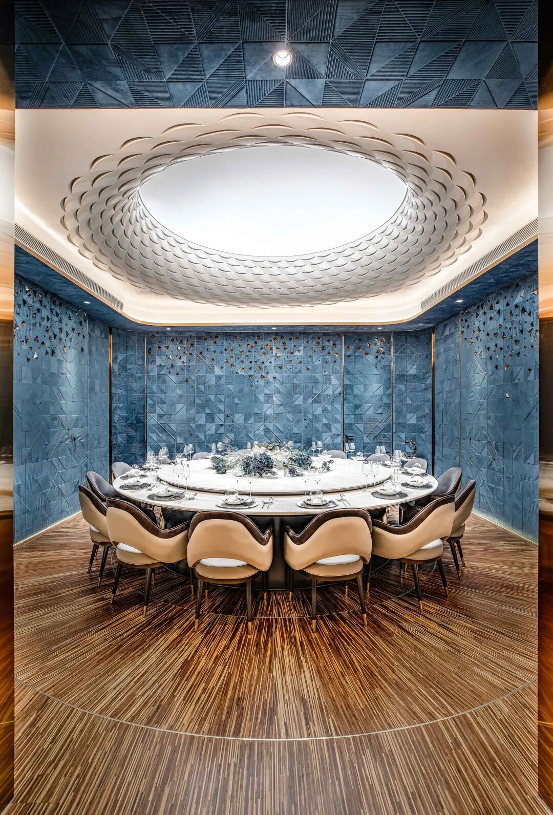 VIP 3室由宴会厅、附设的影音休息室以及独立的盥洗室组成,形成一个具有私密性的封闭区域。宴会厅以“海洋”的意象为设计主题。天花的构想源自阳光穿透海面,荡漾开层层涟漪,由内而外层层散开的几何造型,像波纹,又像花瓣,成为空间一大亮点。墙面用具有凹凸几何效果的海绵壁纸做装饰,兼具美观性的同时,也具有吸音、隔音的效果,墙面以金属条做分割装饰,并点缀立体金属饰品模拟深海生物,反光的材质像多彩的贝母,又像熠熠星光,在整体宴会厅的氛围灯笼罩下,补充多点闪亮的效果。