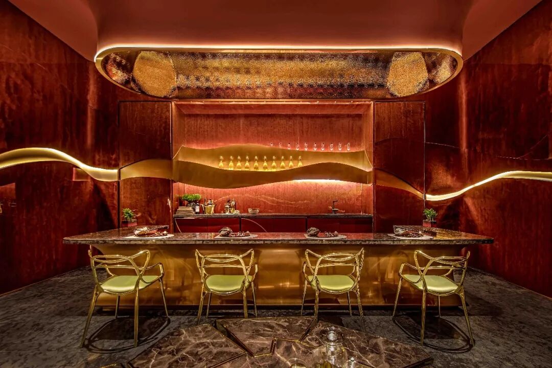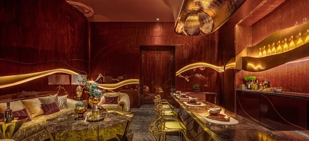 VIP 2室(铁板烧室)以“火”的意象为设计主题,墙面以及操作台酒柜都用树脂板做延续的波浪型,材质反光的特性搭配灯光效果,让空间情境有一种如醇酒般滟滟波动的梦幻感。