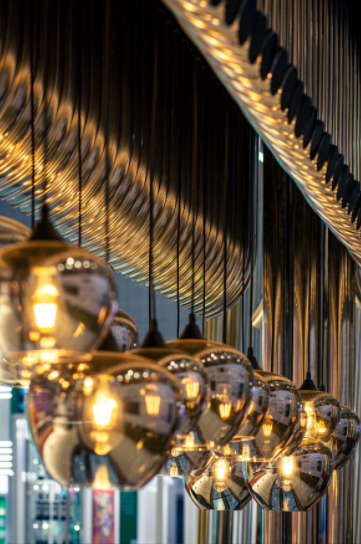 Inside, materials such as brass, mesh, and natural grains convey warmth and authenticity, while maintaining a refined modern tone. The integration of sound, texture, and aroma transforms the pavilion into a “living installation” — a dialogue between agriculture, architecture, and emotion. The interplay of light and shadow, created by suspended fabric strips and softly glowing metal fixtures, enhances the atmosphere of motion and play.