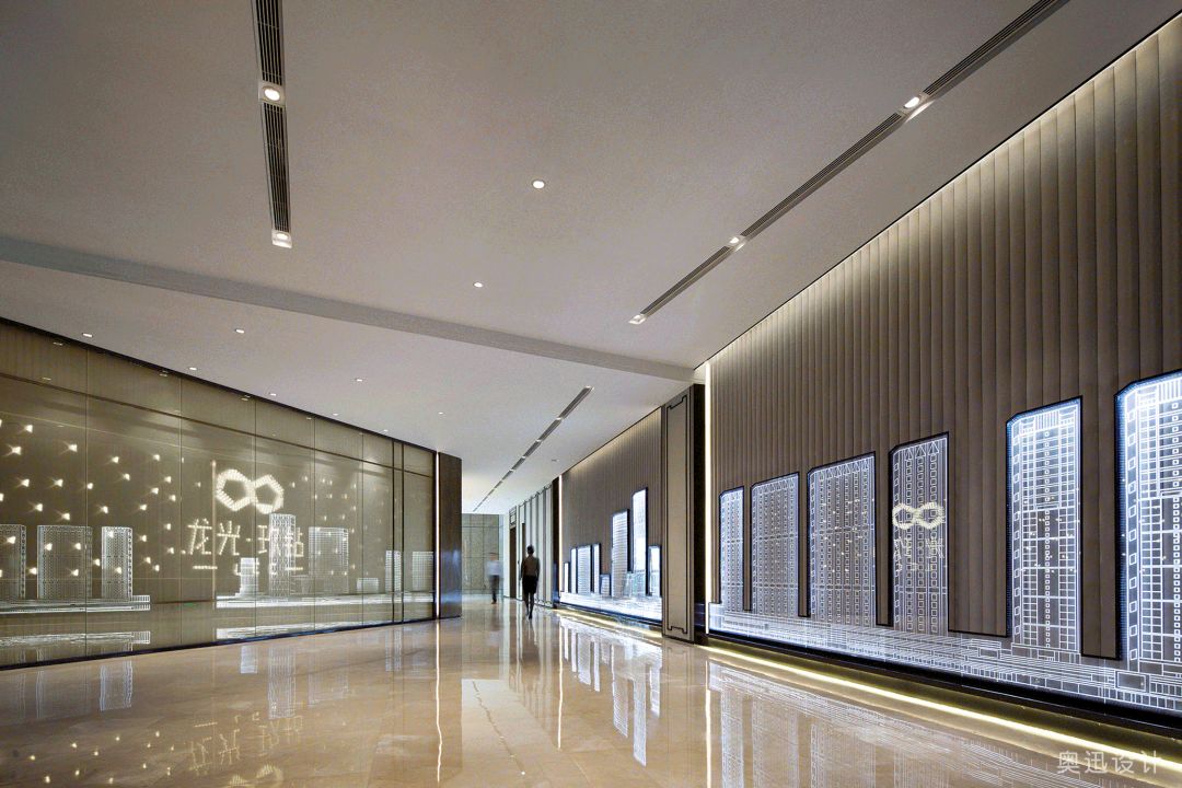 平衡对称的中国传统建筑原则显见于沙盘区域的设计中。以现代中式极具质感为主线,运用线条、色彩、形态赋予空间灵动性,金属、古钢板饰面等现代材质合理利用令空间的气势不断延伸,让整个空间更富张力,渗透着优雅而尊贵的气质。