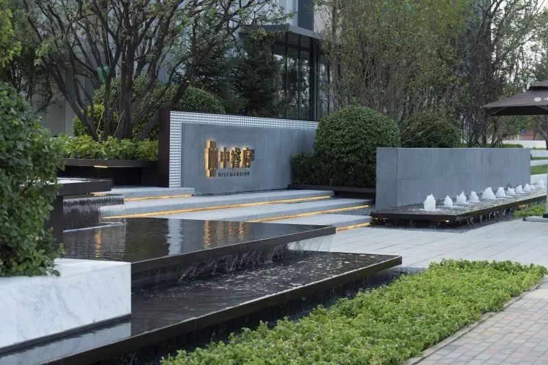 作为主要迎宾展示界面,设计团队将入口区域作为展示区着墨最多的空间进行打造。在处理手法上结合地形高差,运用台阶、跌水、景墙及涌泉等多种语言营造入口的仪式感。
