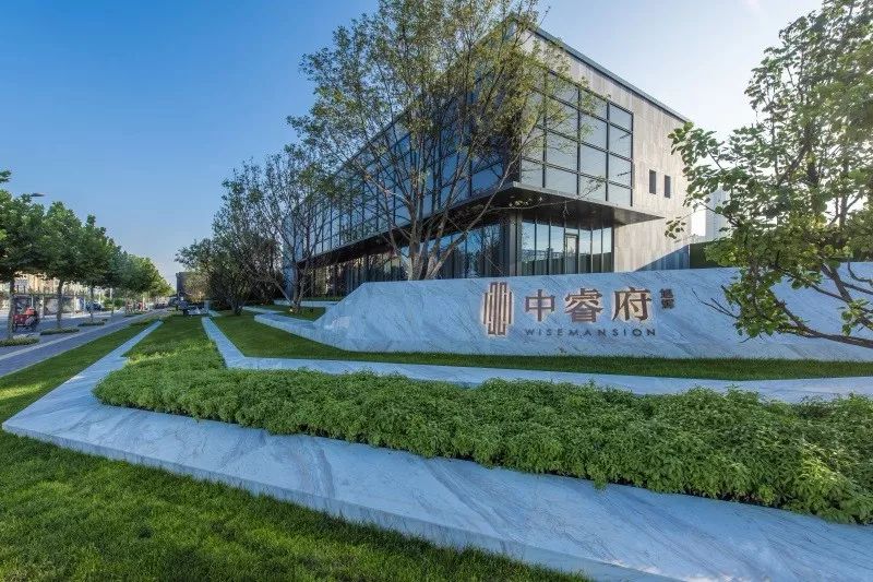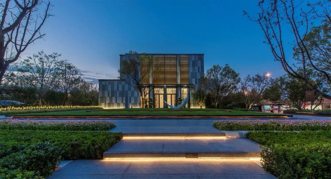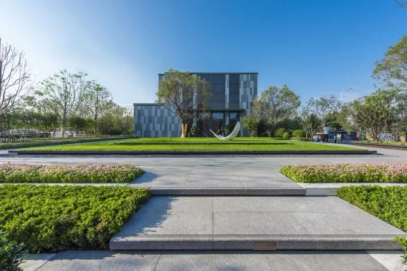 行至近处,销售中心掩映在层层种植之中,与转角处的开放式处理对比,形成丰富的景观层次。