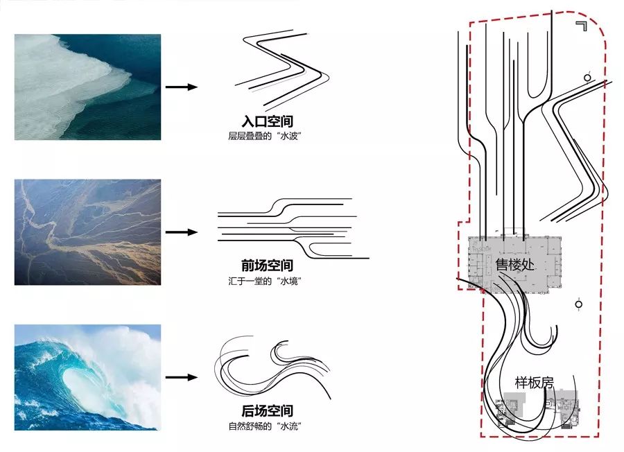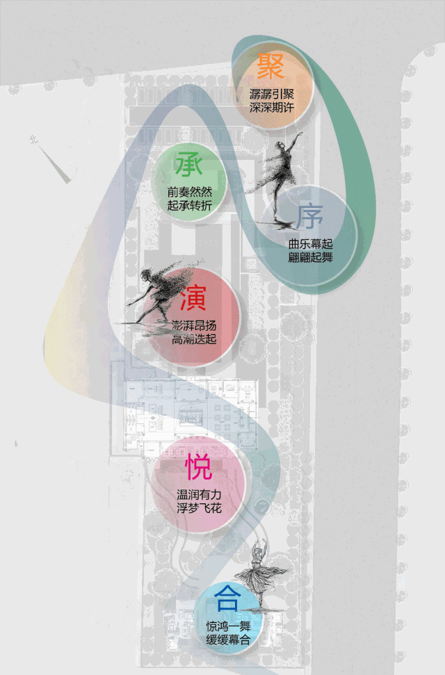 印月府示范区如同一个大舞台,在此即将上演一场精彩绝伦的芭蕾舞表演。开场、前奏、高潮、谢幕,设计团队策划出不同的空间体验,以一定的物镜空间为基础,调动客户感官情绪,创造客户理想生活方式的构成情景。