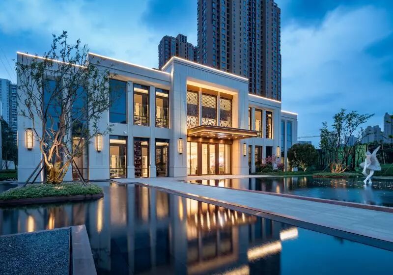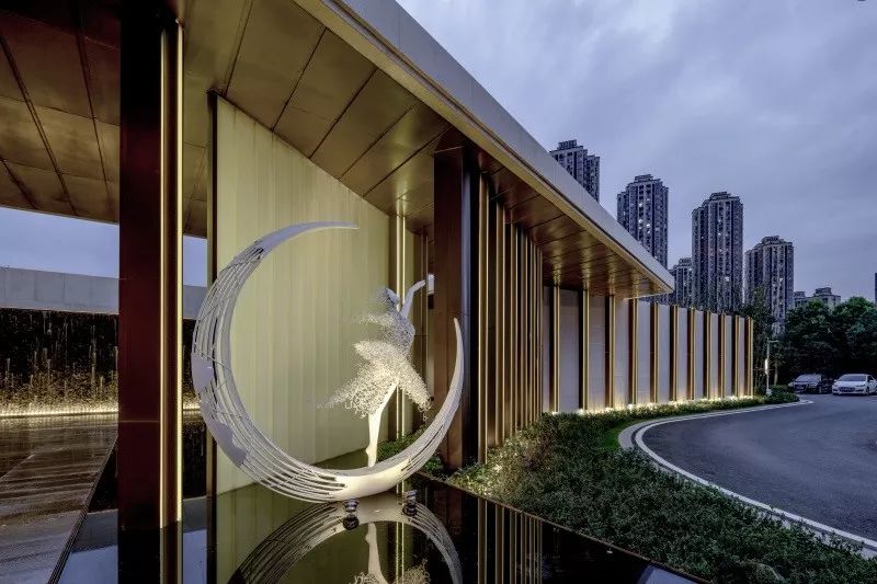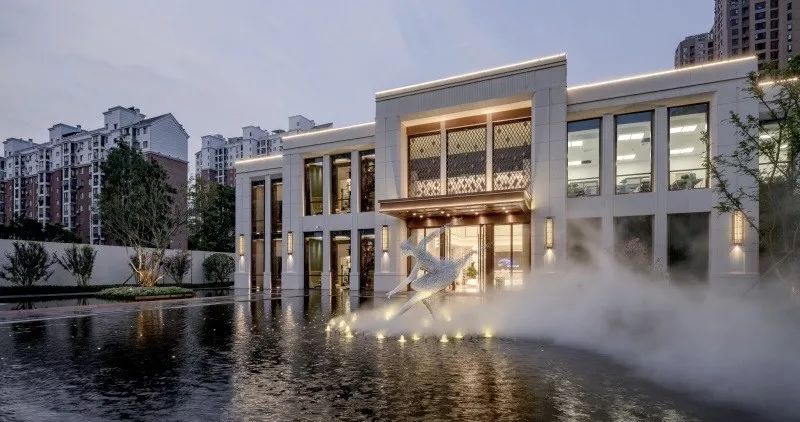 一池静水映衬着威仪的销售中心。感风而动的池水,时而平滑如镜,时而泛起涟漪。一张张乐谱洒落在景墙上,舞者在水面上舞动着轻盈的身躯,她美丽的舞姿闲婉柔靡,机敏的迅飞体轻如风。夜幕下,灯光熠熠,舞蹈澎湃激昂,高潮悄然而至。
