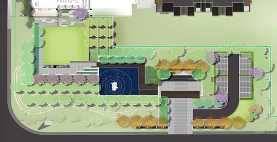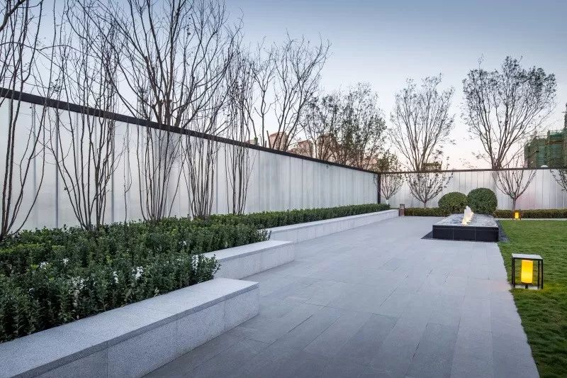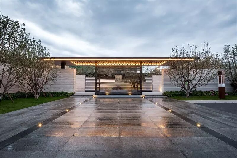 入口空间引入了文化传承,运用充满张力的体块化景墙,在街景中脱颖而出。进而花海配合欢迎涌泉成为入园的第一印象。一进景墙与二进景墙遥相呼应,层层递进,空间上塑造雅致庄重之感。夜晚点亮星光灯,营造了序列礼制氛围,携典雅的东方美学灵魂,续写充满时光的气韵,筑就雅士之范。