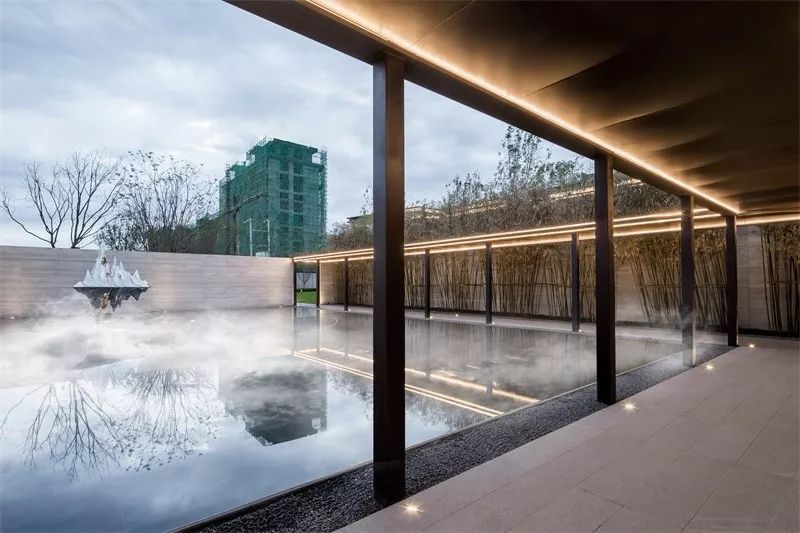 透过竹影的幽光,隐见浮山闪烁,不得其解,故顺级而下,进入第二院落空间,更见流云氤氲,展卷出一汪山水,山成为联结起各空间的纽带。引入自然光线的核心。移步换景,竹影听雨廊,四顾,延续的素雅白木纹一气呵成,与竹相得益彰,浮山倒影,雾蔼,流岚,水天一色, 巧妙地打破了禁锢,带来通透开朗的层次感和纵深感。