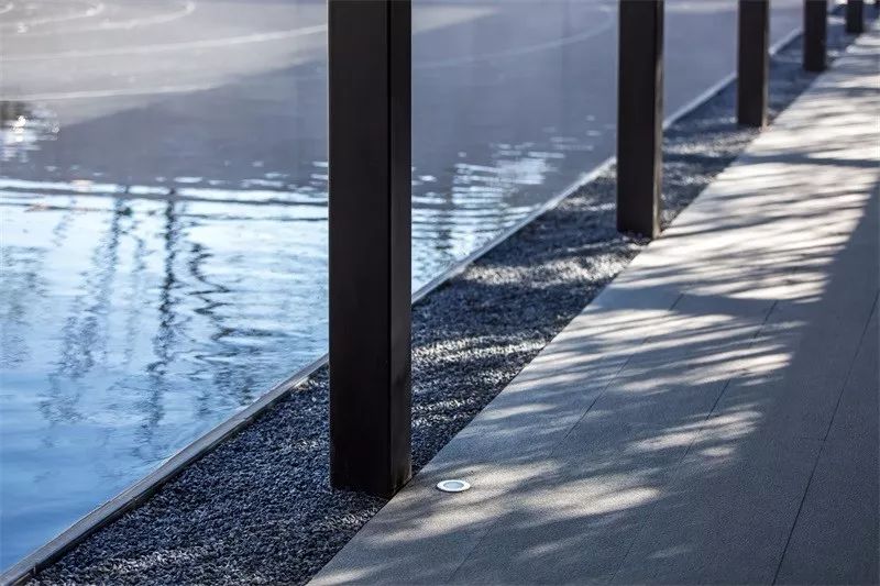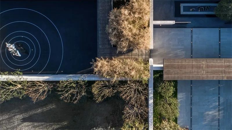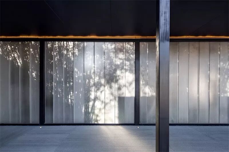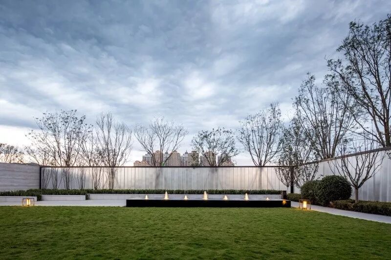 听闻潺潺水声,通过一方沉静,忽而天光乍现,豁然开朗。三进院落,双眼弥望的,是草坪、流泉、漫道、叶影,心灵深处,遂流露出与自然融通之感。通透而开敞的空间,让光尽情挥洒,呈现光影舞动的瞬间。阳光草坪尽端的树阵光影斑驳,在U玻前如跳跃的精灵,挥洒自如。