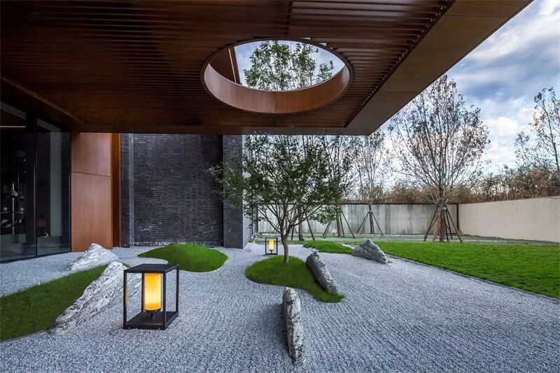 山水尽收眼底,俯瞰万里,四进院落带给人的是幽静与冥想。走进枯山水,步入庭院之中,将喧哗的都市隔绝开来,传递出自然与生命气息。建筑出挑的圆洞,光束随天井而下,抚摸着层峦的脉络,反射着四周的翠色。昼时,深深几许;伏夜,微光皎皎繁多。曲径通幽,花木荫浓,让人驻足良久。闭目,冥想,放空,清风朗月,举酒永杯,品味低调内敛的悠然气质和“源于自然,归于自然”的简素生活美学。