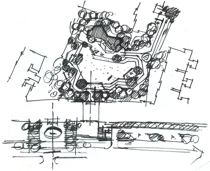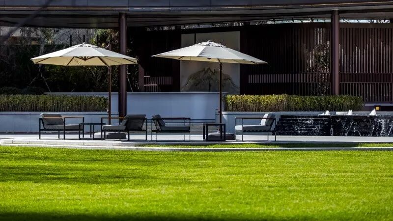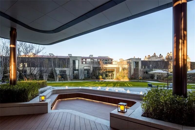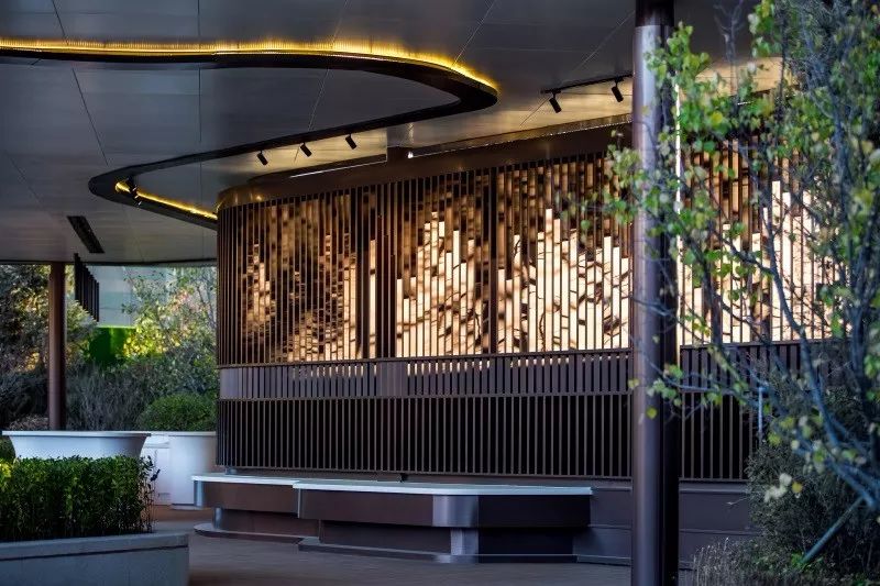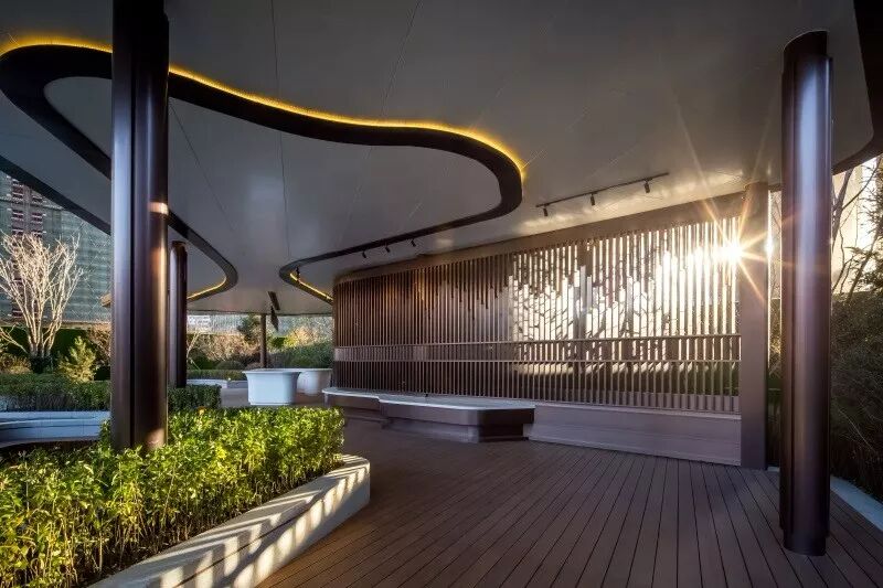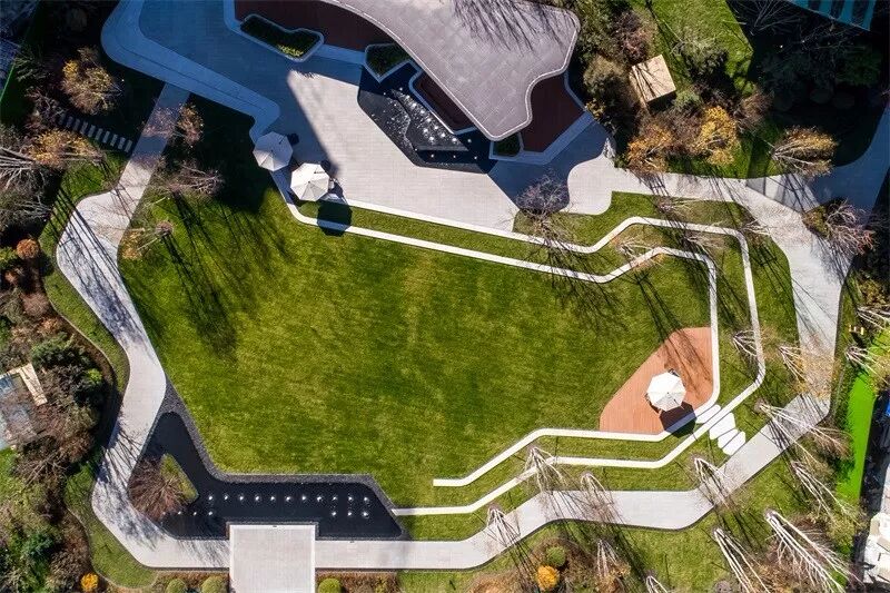 将景观作为手段缝合建筑之间的关系,摆脱不规则排布建筑的冲突感,平衡人与建筑、与环境之间的关系。我们创建了一个大的空间基底,用一系列自由形态场地代替经典的规则空间,同时用圆角线条代替直角线条,融合植物空间,这样水景、构筑物和植物三种元素毫无缝隙地连成了一体。