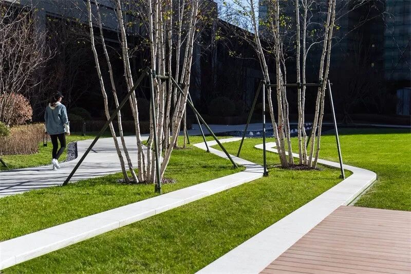 丛生的本地树种白桦大量片植,支撑主体空间。白桦林作为一道亮丽的风景线,给人诗意的穿行体验。