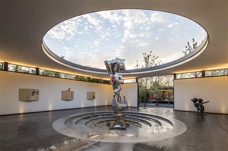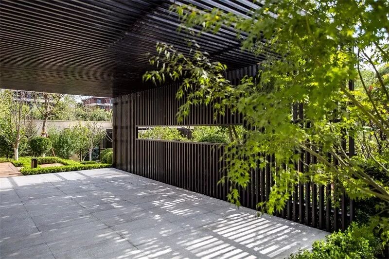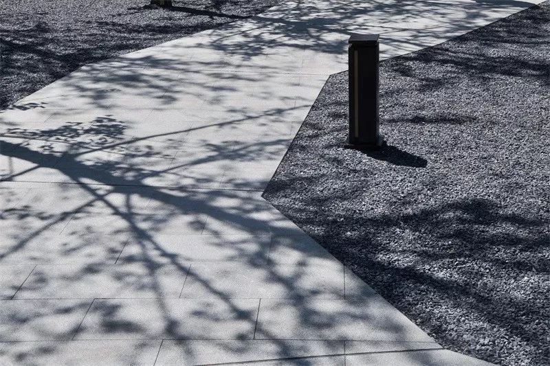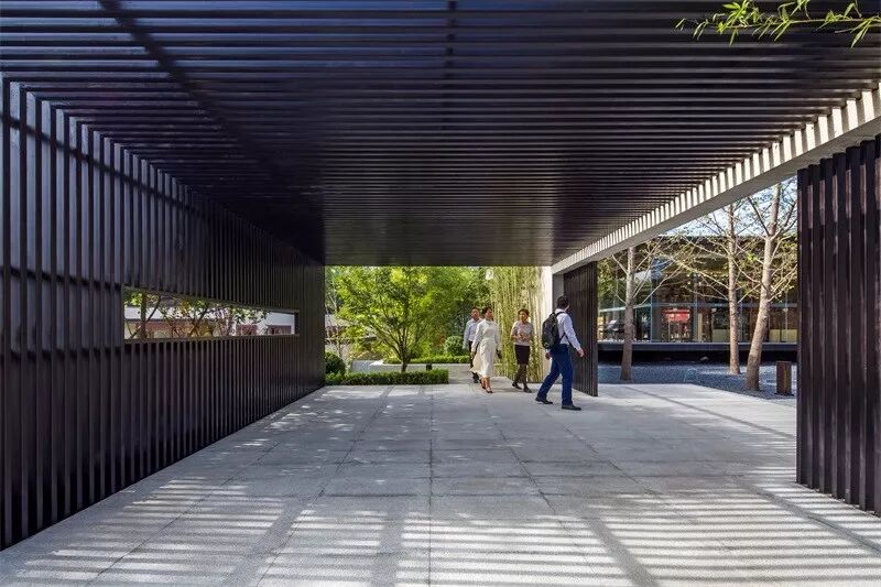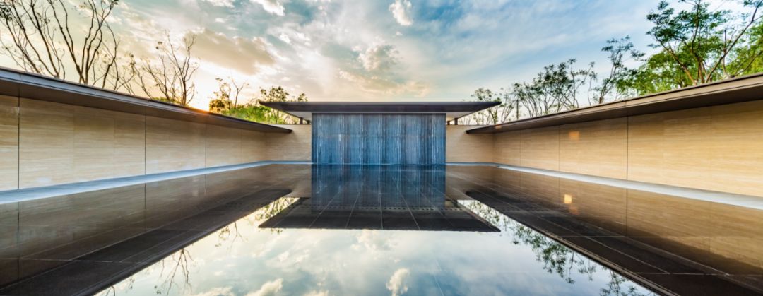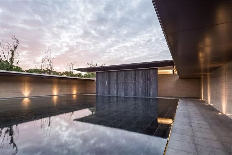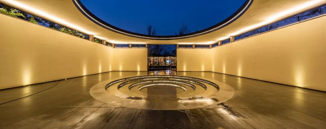 设计团队设计了一座具有中式韵味的大门,无论从设计语汇还是形态上,都具有抽离感,营造出凝练、安静的氛围。两侧围合的景墙与水景将门庭空间围合起来,形成了一种场域感——从熟悉的城市空间环境抵达到更平静、永恒的空间场域。