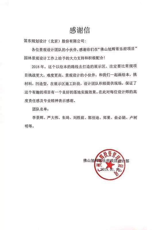 常乐府示范区的景观设计得到了甲方的高度认可和赞誉,项目设计部给予了DDON笛东设计团队一封真挚的感谢信。