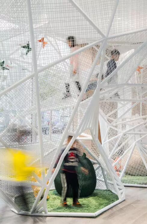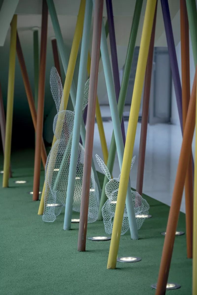 室内引入了北极光、兔子洞、魔幻泡泡球等梦幻元素。主角兔子阿布的雕塑,一半的身子在室内,通过金属网镂空的处理,成为孩子们玩耍的神秘洞穴。