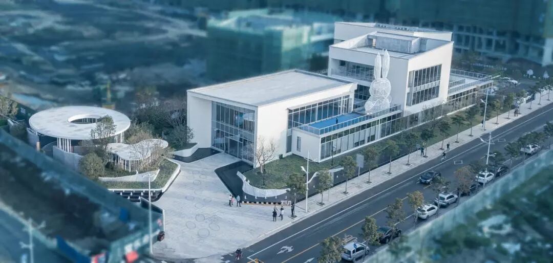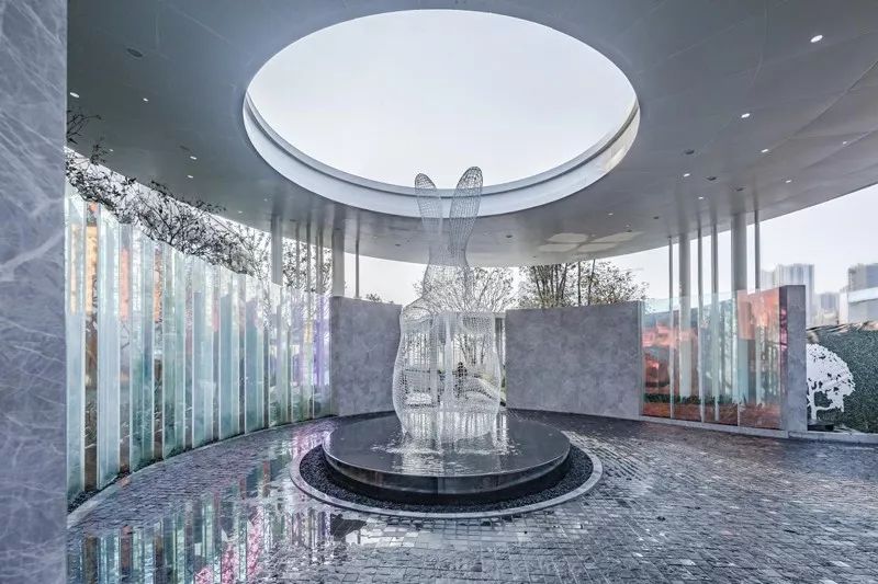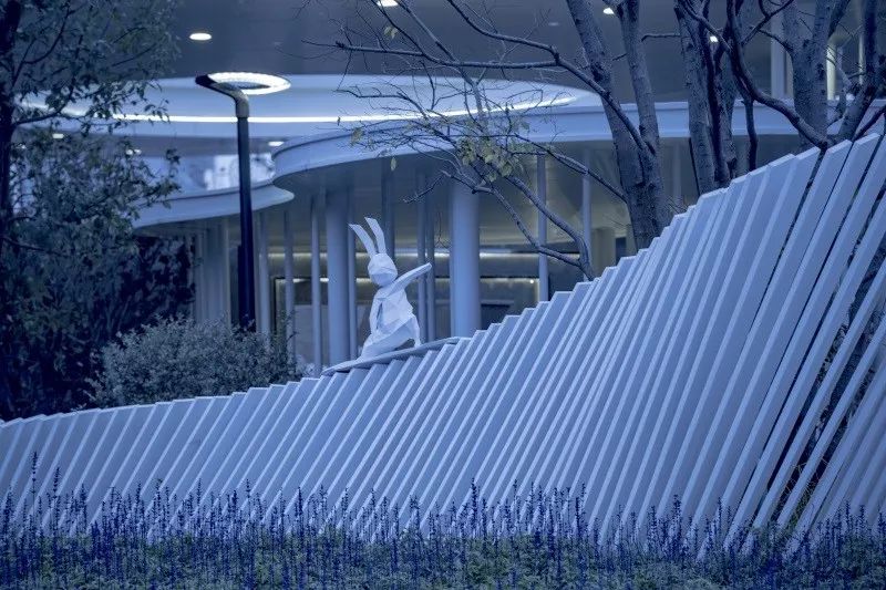 ▲兔子阿布以不同的造型出现在项目的多处,售楼处入口的水景上将兔子雕塑与波浪钢板结合在一起,弱化了建筑的棱角,也带给客户欢乐愉悦的场景氛围。