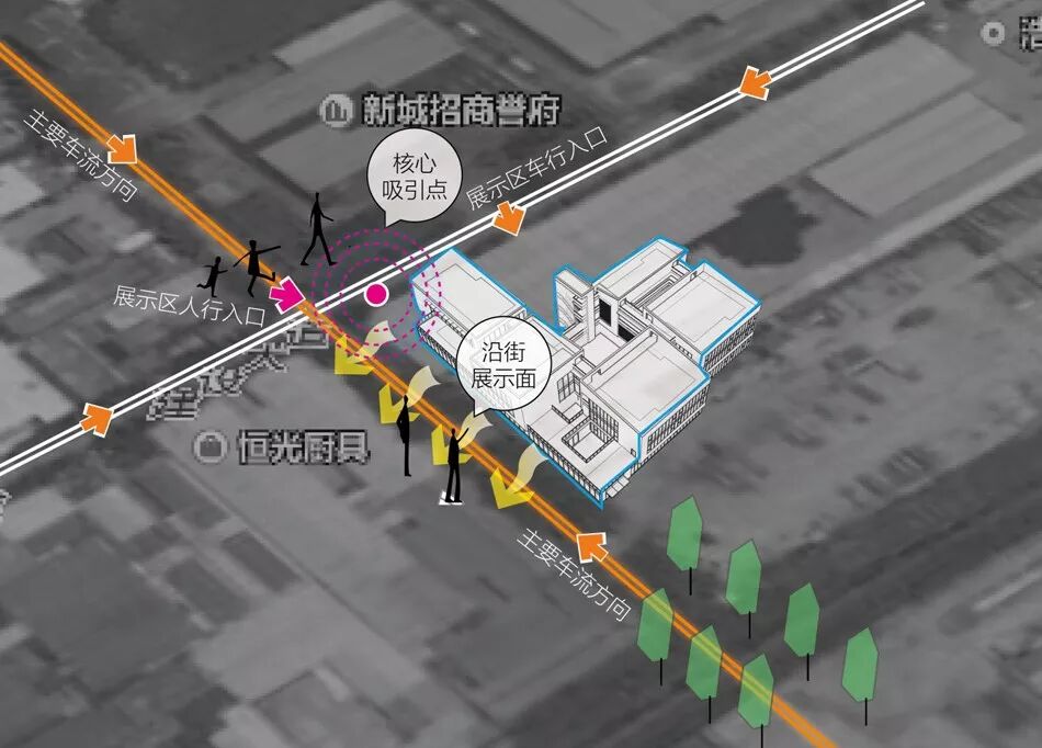 ▲建筑西侧形成了橱窗展示界面,景观通过设置镜面水景,烘托了建筑的氛围,同时建立了建筑、室内与城市界面的对话。
