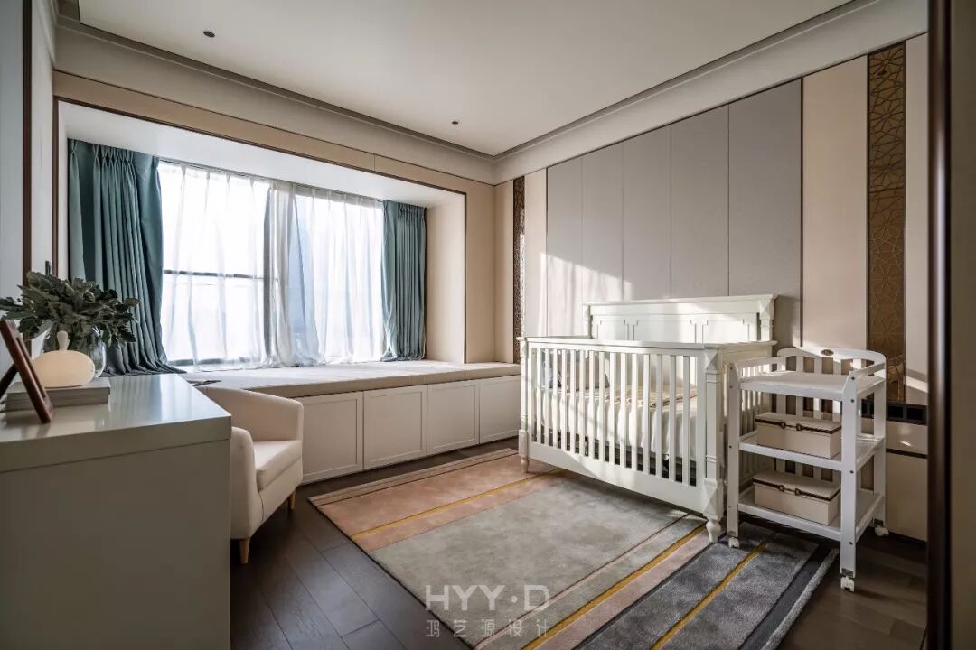 两间婴儿房以淡粉与水蓝作为区隔,配备成对的婴儿床、衣橱,还有一件件童趣别致的玩具。在设计中,鸿艺源设计贯穿着对未来生活的考虑,为居住空间留有成长与进化的可能。婴儿房及儿童娱乐室均在背景墙的设计上做了预留手法,随着孩童的成长,家长只需将家具进行替换,无须进行二次装修。