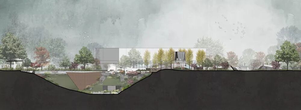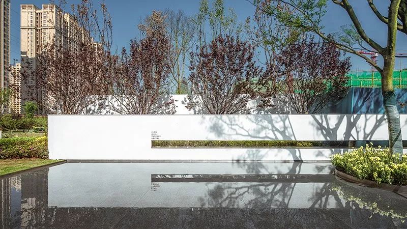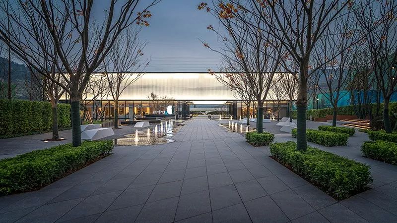 通过建筑与景墙的巧妙结合,将云篆山的自然山脉框入画中。近景雕塑、景墙的留白让对景的空间形成一个整体。