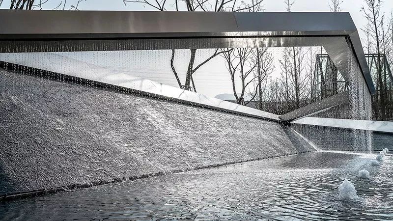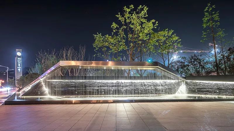 沿山形景墙步行至尽头,空间豁然开朗,仿若峰回路转间又别有洞天。在山石中悬挑出一幕水帘,雨霖无尽垂落,有大珠小珠落玉盘之声色,将自然感与现代感完美统一,在心中留下水的初印象。主入口叠水景墙与云篆山整体山脉融于一体,通过山、水、雾等自然元素的演绎形成云篆风清的景观韵律。
