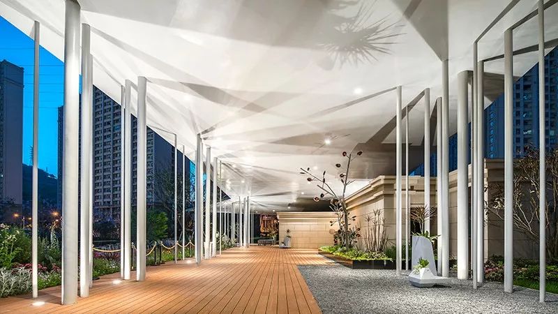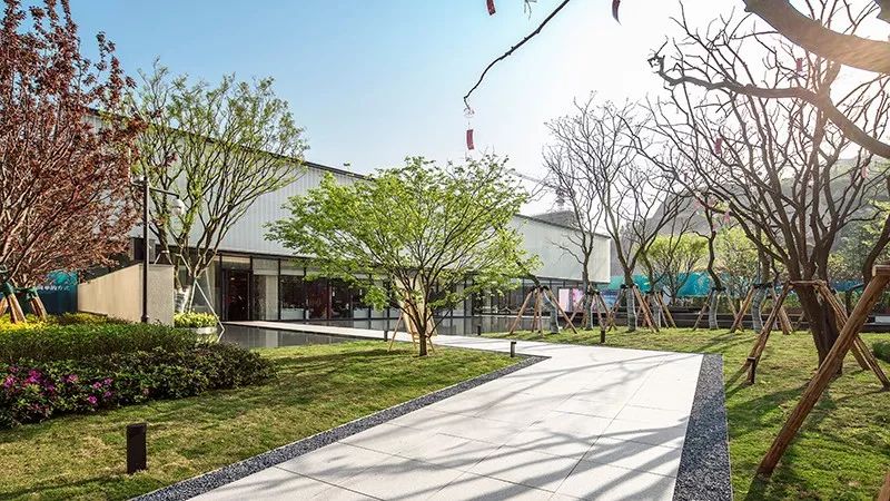 旭辉·江山青林半项目位于重庆巴南鱼洞云篆山风景区山脚,环境优美。示范区的设计主要解决三大问题:一是项目距离市政主干道稍远,示范区需要吸引人流,并能留住人流,借助良好的自然环境为周末家庭出游或亲子游提供场地;二是整个片区配套不完善,毗邻公租房,周边居民迫切需要日常休憩的场地;三是未来的商业建筑前期作为售楼部,示范区前场作为商业广场,实景展示未来的商业配套空间,后场空间结合场地条件转化为社区公园。带着解决这三个问题的主导思想,DDON笛东设计团队对建筑与场地关系进行了再思考,遵循“一半青林一半城”的理念,打造项目示范区。