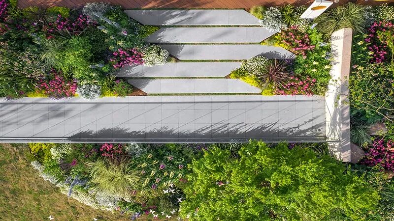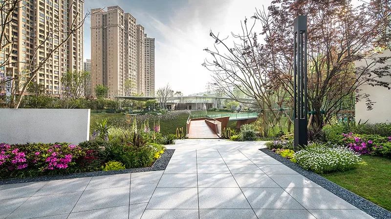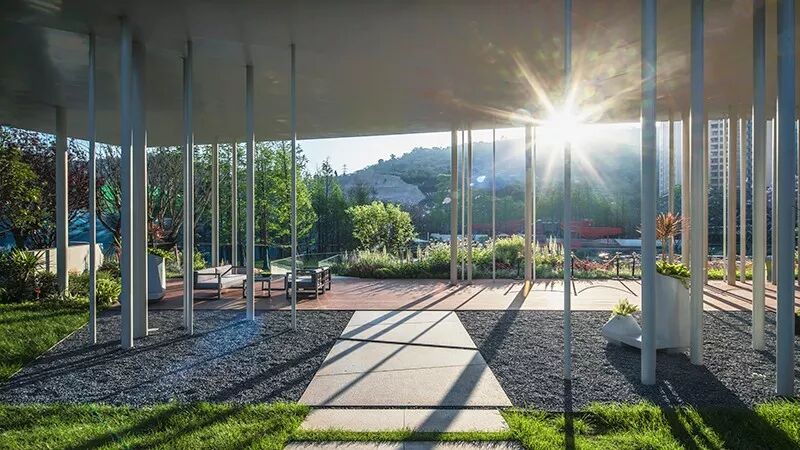 出销售中心,沿栈道抵达一片清雅之境。依势天然山谷的坡度,以观赏花草做植栽,点缀艺术装置,打造一座清新幽然的生态花谷。花谷之上以休憩平台点睛,静坐其间,仰观山林青绿,俯察花类竞荣。