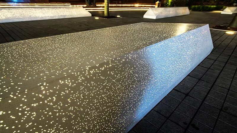 休憩广场上布置了泛星光灯的坐凳。坐凳由中空整体浇筑的透光混凝土石条打造,这是透光混凝土在重庆的首次运用。苍穹繁星点点,迷雾透光灼灼,是星空穿透了迷雾, 还是在迷雾中拾起了散落的星斑?