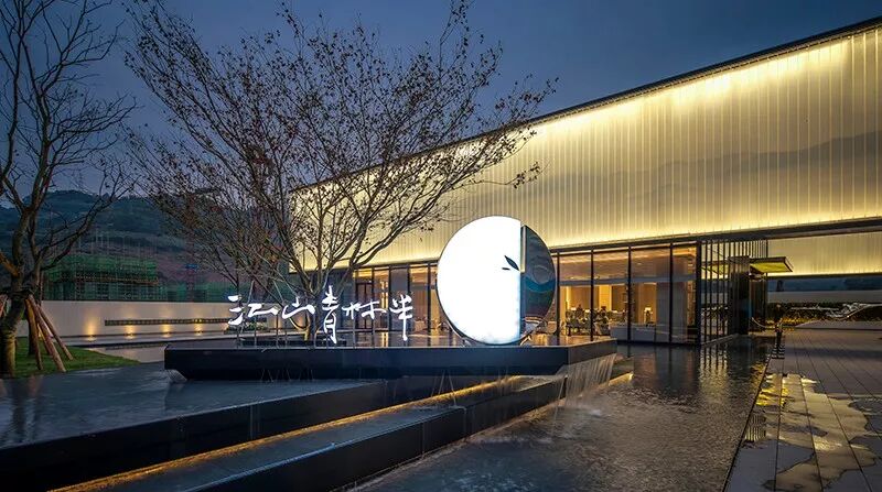 案名LOGO自然地与水景、植物形成很强的雕塑感。在LOGO的设计上也是强调青林半的“半”字,晚上与灯光的结合形成半轮明月的景观意境。