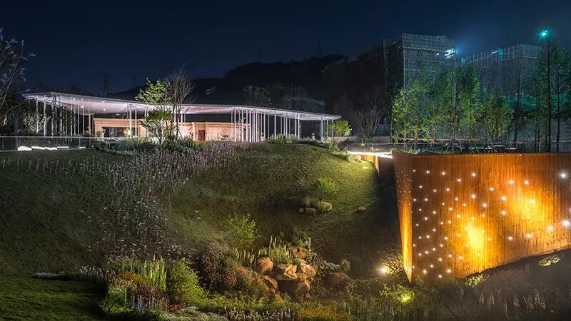 将“山的起伏”概念化,设计成简约的景墙列于道旁。道路由宽到窄,空间由大到小,犹如进入秘境山谷,与自然对话,畅叙幽情。