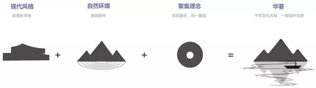 景观设计结合当地文化元素与现代手法,遵循经典,演绎时尚。在诠释现代美学的基础上,注入文化元素。设计灵感源于绍兴后马八景,取其中五景作为示范区景观空间:入口合院(板桥书屋)、前场空间(趣园墨池)、看庭空间(闲亭松籁)、水庭空间(西园水榭)、后场空间(花梗渔唱)。